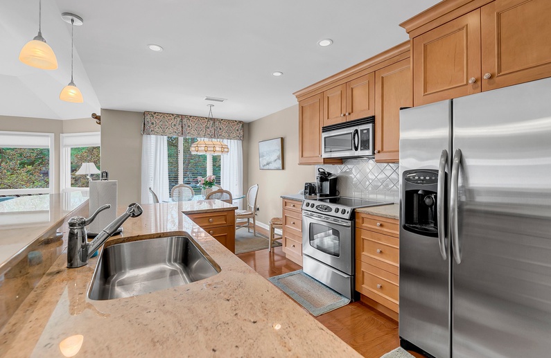 As you step inside, you'll find a bright, modern kitchen immediately to your right, complete with stainless steel appliances and plenty of counter space for preparing meals. Just off the kitchen is a dining area with seating for up to six, perfect for family meals or entertaining guests.