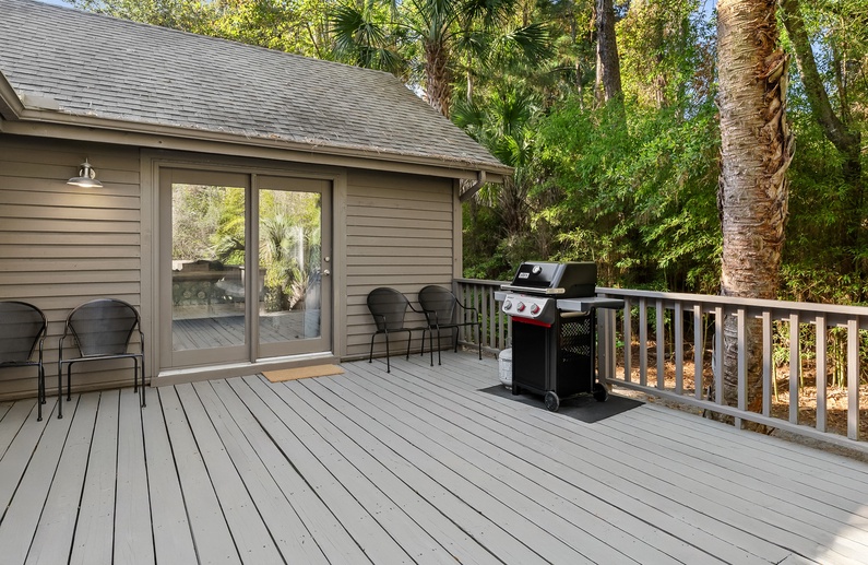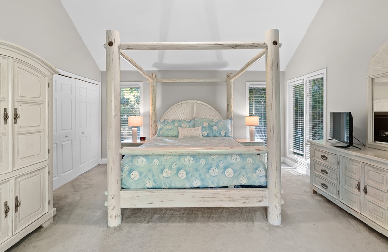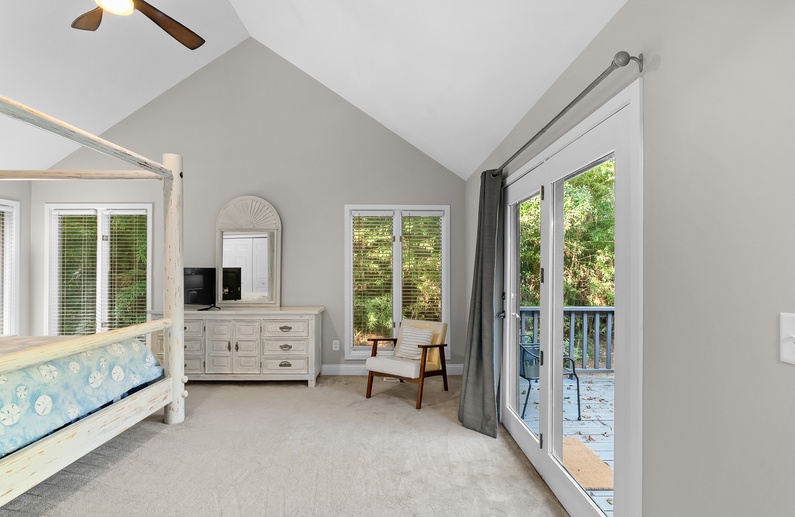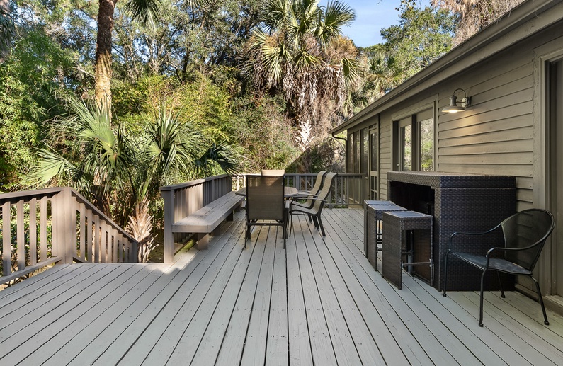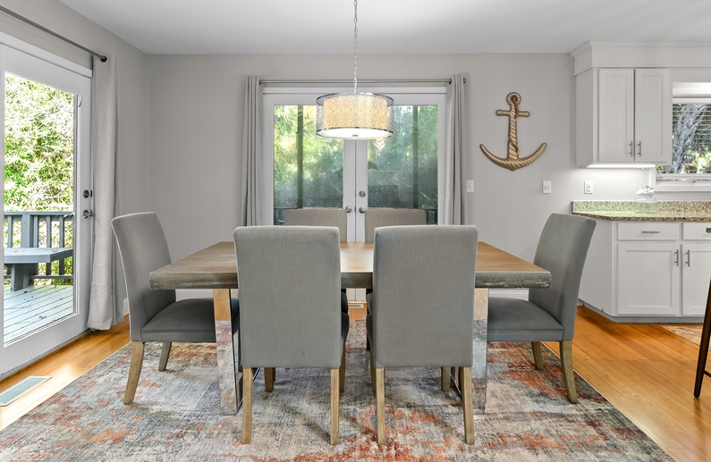 As you enter the home you’re greeted by beautiful vaulted ceilings in the living area, accompanied by leather furnishings and a stunning blue shiplap accent. The fully equipped kitchen boasts sleek stainless steel appliances, granite countertops and white cabinetry. A small breakfast bar has seating for two, and flows into the spacious dining area that is suitable for eight. Just off the dining area is a screened porch with a loveseat and two chairs, perfect for relaxing with a morning cup or coffee or an evening cocktail while enjoying the beautiful nature of Kiawah Island. The large deck also offers plenty of seating as well as a dining table and built-in bench.