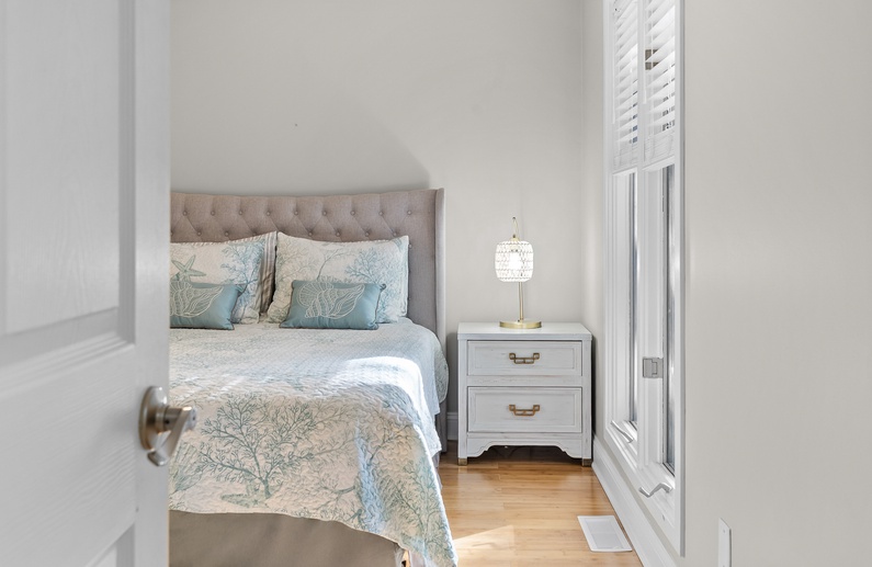 The primary bedroom features a king size bed and a small television. A stylish en suite bathroom provides a sleek new white vanity, walk in shower plus a luxurious soaking tub. In the second bedroom you’ll also find a queen size bed and television, plus an attached renovated bathroom complete with a walk in shower. The third bedroom provides a queen bed, and shares a full bathroom with the fourth bedroom highlighting two twin beds.