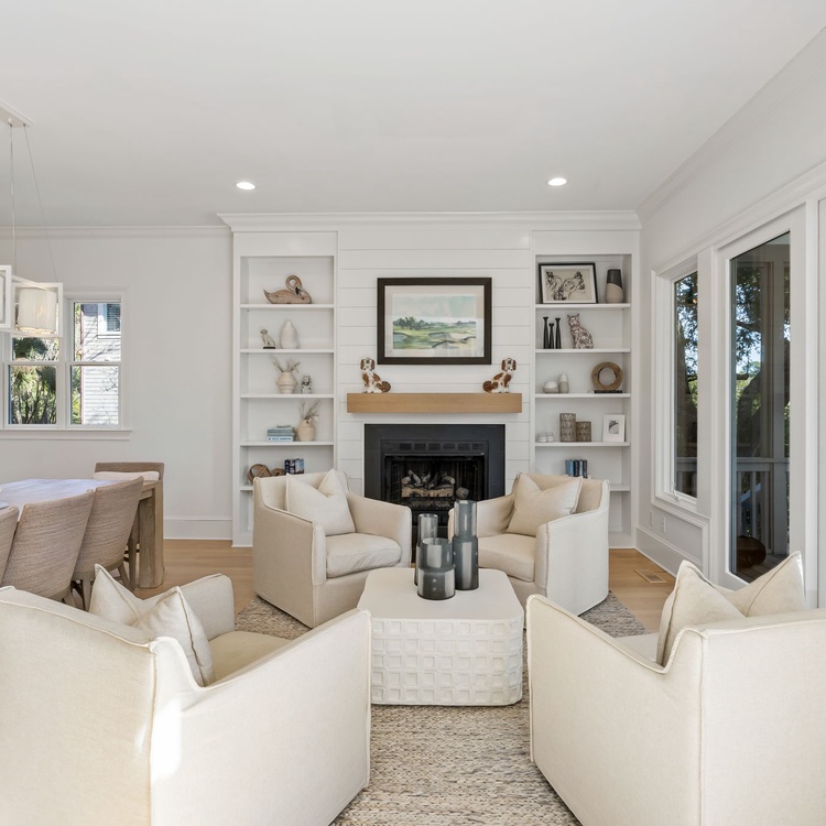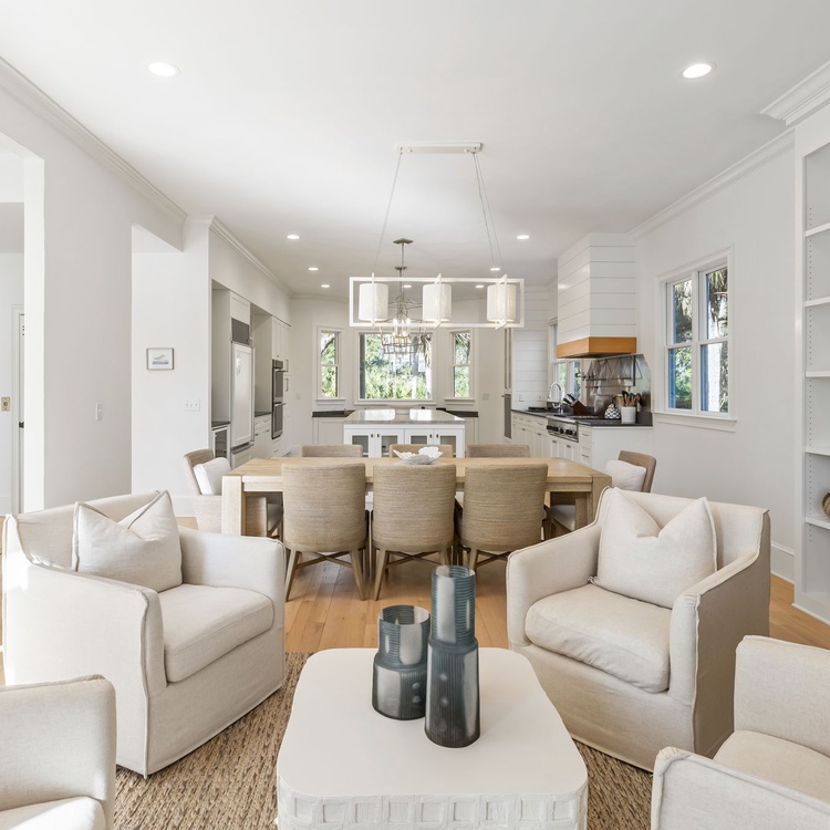 The main living area is filled with natural light and features beautiful built-ins surrounding the TV, along with a comfortable sofa and accent chairs that create an inviting space to unwind. Just beyond the living room, the open and airy kitchen is finished in crisp white tones and includes a built-in gas cooktop, double wall oven, and seating for 4 at the end of the island. It’s perfect for casual meals or morning coffee. The dining room sits just off the kitchen and comfortably seats up to 8 at a lovely gray-toned natural wood table. On the other side of the dining area, a cozy sitting space is arranged with four accent chairs around a coffee table, overlooking a decorative fireplace that adds charm to the room (not available for guest use). From here, step out onto the screened porch, where a large dining table seats 8 and offers a relaxing spot to enjoy meals or evenings outdoors. The spacious deck, accessible from the main living area, is outfitted with lounge chairs and a gas grill for guest use, all while overlooking the Osprey Point Golf Course and its peaceful lagoon views.