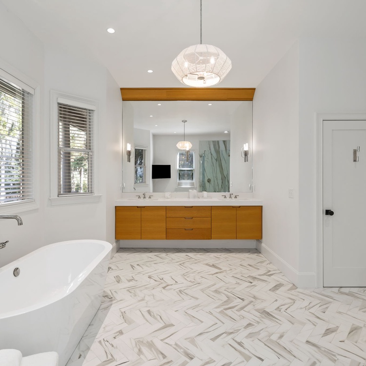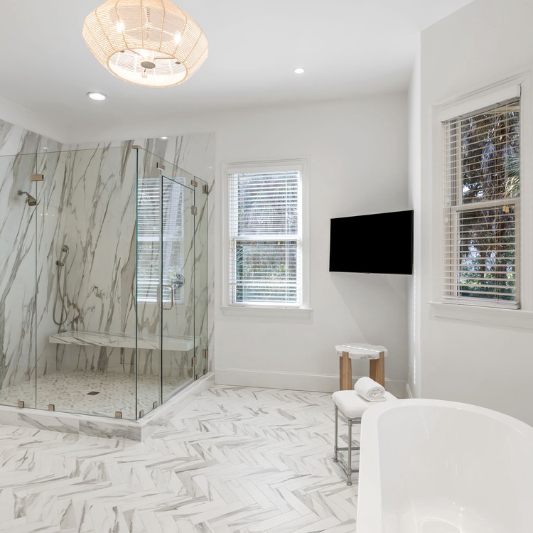 The primary bedroom is conveniently located on the first floor and serves as a true retreat, featuring a comfortable king-size bed, a sitting chair, dresser, and a wall-mounted TV. The en suite bathroom is especially luxurious, complete with a large soaking tub, dual vanity, an elegant marble walk-in shower, and even a TV for ultimate relaxation.