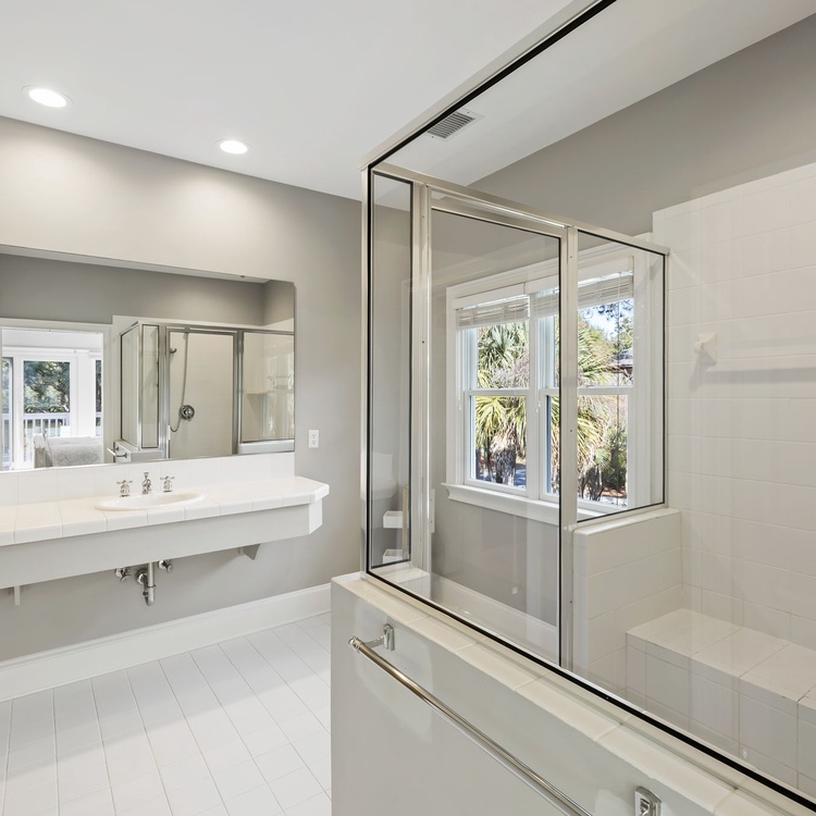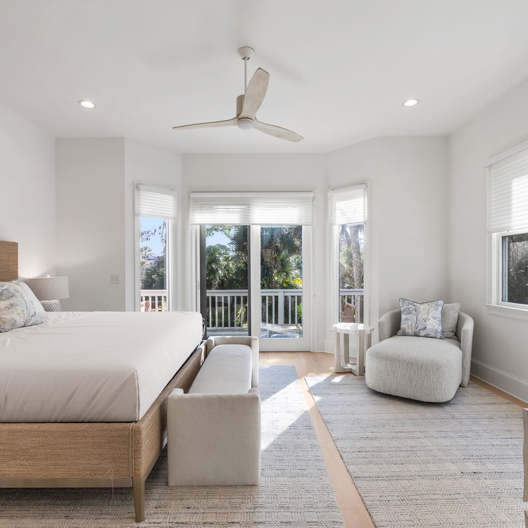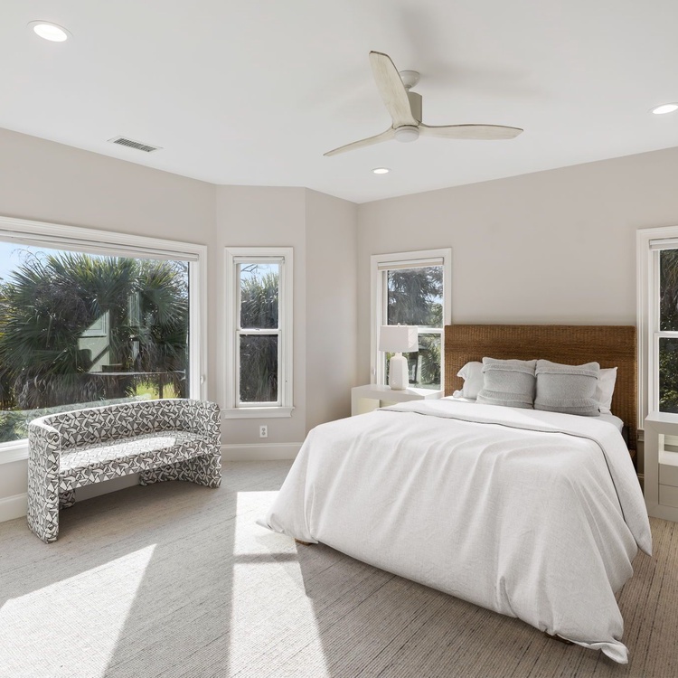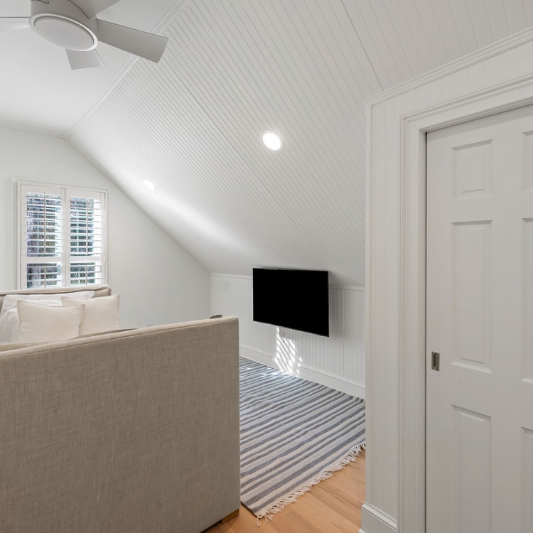 Upstairs, a second living area provides additional space to spread out, with plenty of windows, a large comfortable couch, and a TV set above an entertainment stand. The remaining bedrooms are also located on the second level. The second bedroom features a king bed and access to a private deck with lounge chairs, along with an attached bathroom offering a walk-in shower and a clean, classic all-white design. The third bedroom includes a queen bed and a charming sitting bench beneath a large window that fills the room with natural light, as well as an attached bathroom with a walk-in shower in the same bright, traditional white style. The fourth bedroom is ideal for children or additional guests and includes a twin bed with a twin trundle and a small TV.