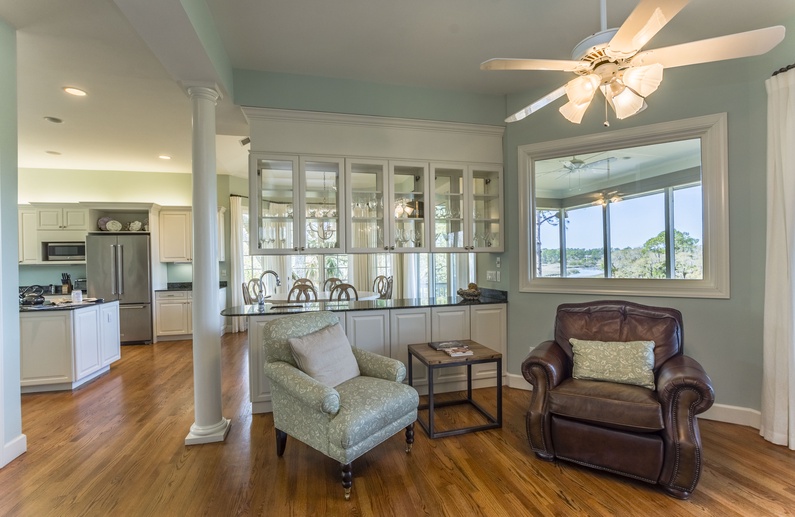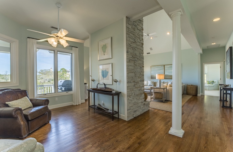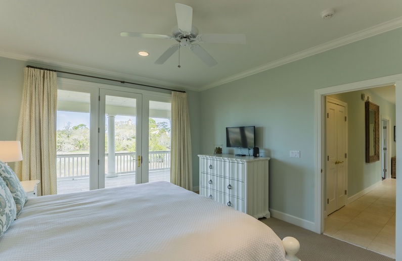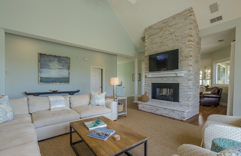 Ascend the steps and behold beautiful vistas. The second-floor suite is on the right, featuring a king bed, large wall-mounted flat-screen TV, bathroom with double sinks and separate bathtub and shower, and access to the second-floor back deck. The living room offers plenty of seating with its sectional sofa and two cozy chairs, generous wall-mounted flat screen TV, and access to the back deck. A sitting area connects the living room and kitchen area. The spacious kitchen features high-end appliances, including double wall ovens, island with Viking six-burner range, and wet bar with wine cooler. Just beyond the dining area are the screened porch and back deck. You will enjoy dining and lounging in the screened porch, rocking on the back decks, and soaking in the serene environment. A half bath is conveniently located on the second floor.