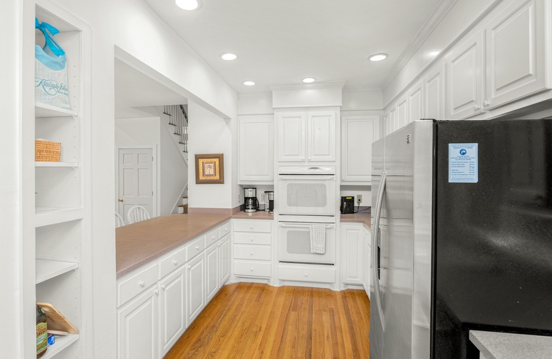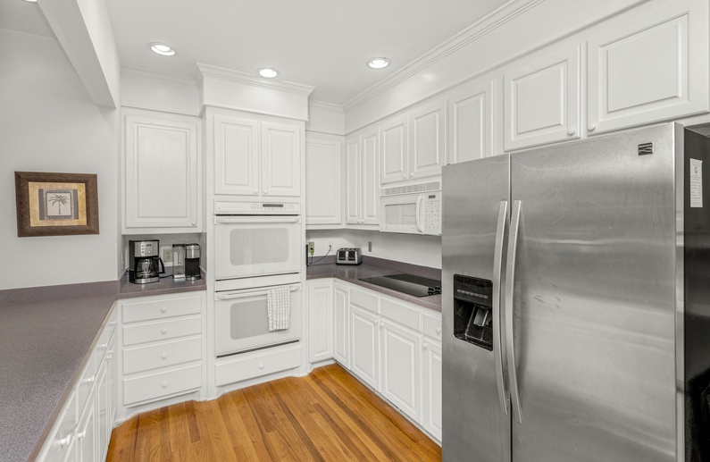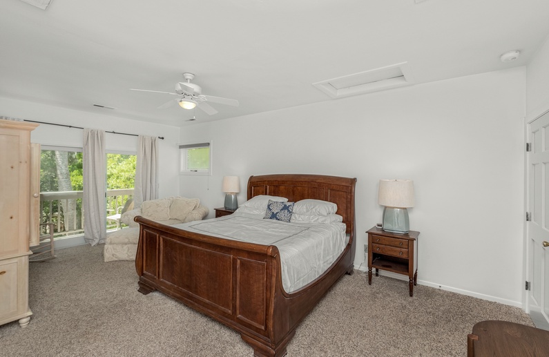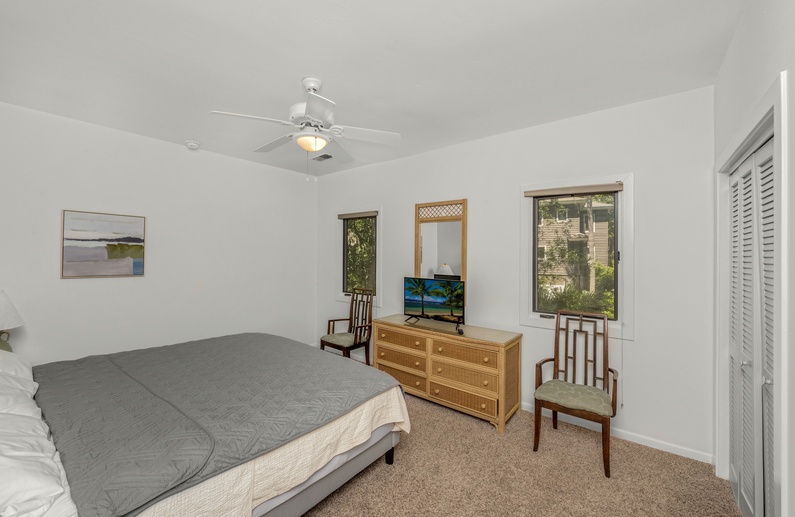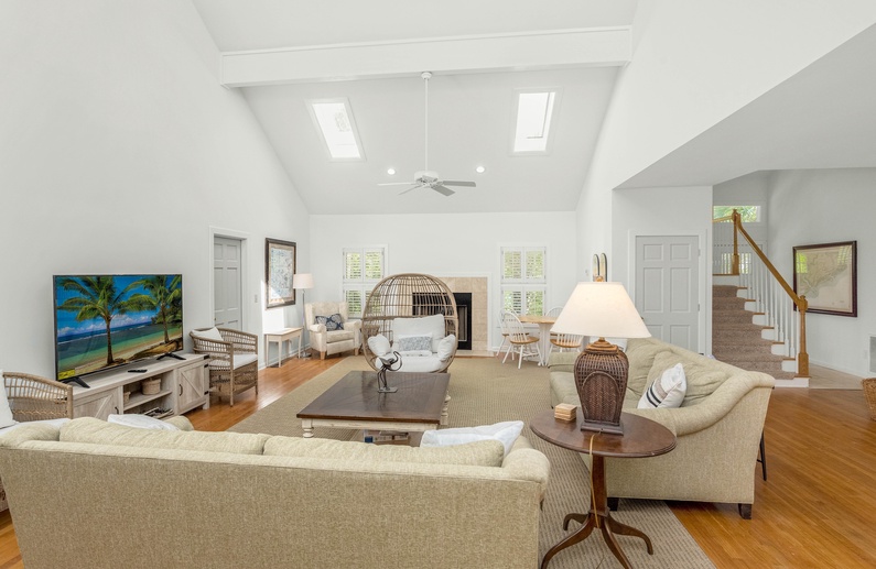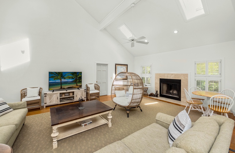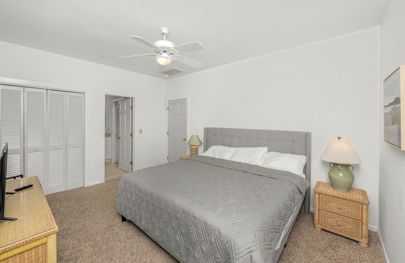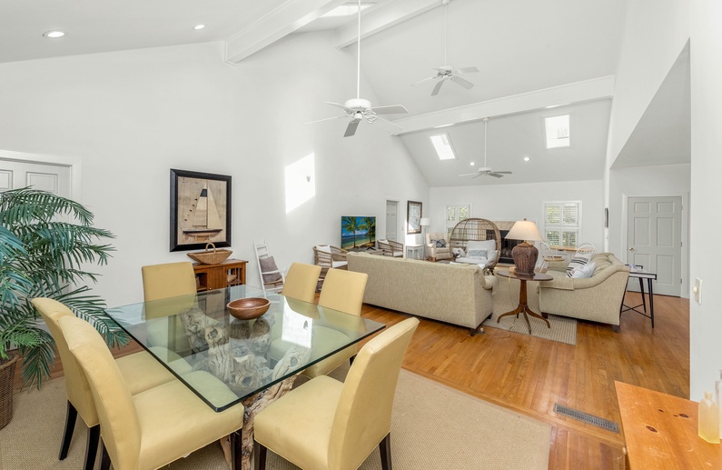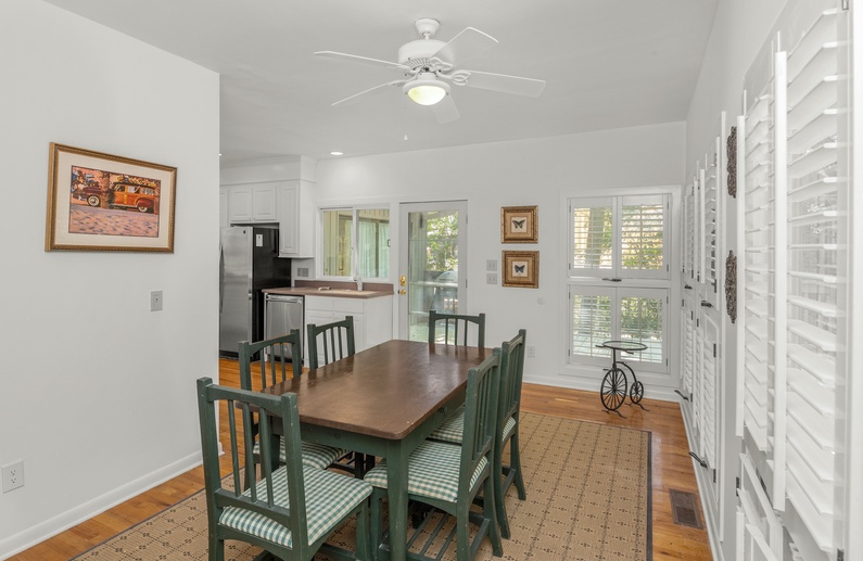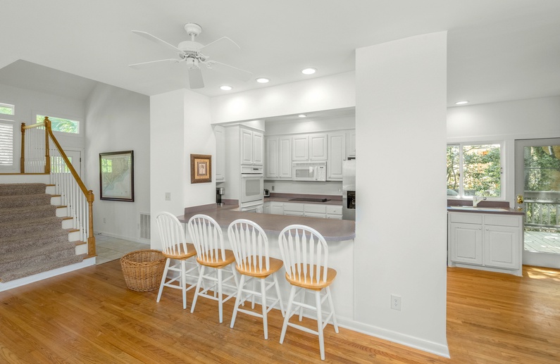 This home’s open floor plan allows for easy conversation and entertaining. The large living area, an ideal place for gathering, offers high ceilings, plenty of seating, and a flat-screen TV. Just past the main living area is the dining area with seating for six guests. The fully equipped kitchen is adjacent to the living area, offering white cabinetry and a pass-through counter with bar stool seating. Additional dining space can be found in the breakfast area, located just off the kitchen, which provides seating for six guests, a TV, and access to the deck.