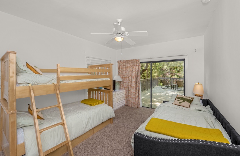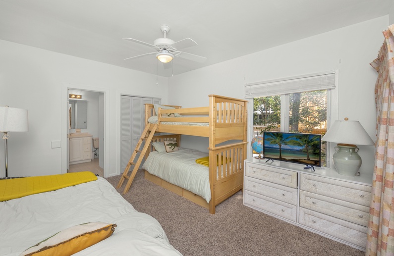 Ascend the stairs to reach the master suite, which comprises the entire second floor. It offers a king bed, TV, cozy side chair and ottoman, and bathroom with double sinks and soaking tub and shower, plus access to a private deck overlooking the pool area. The remaining three bedrooms are found on the first floor. Off the main living area are two bedrooms – one with a king bed and another with two full beds – each with a TV and private bathroom. Located off the entry hall is another bedroom with a private bathroom featuring a twin over twin bunk bed, daybed, and twin trundle.