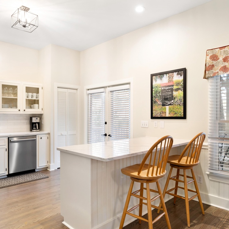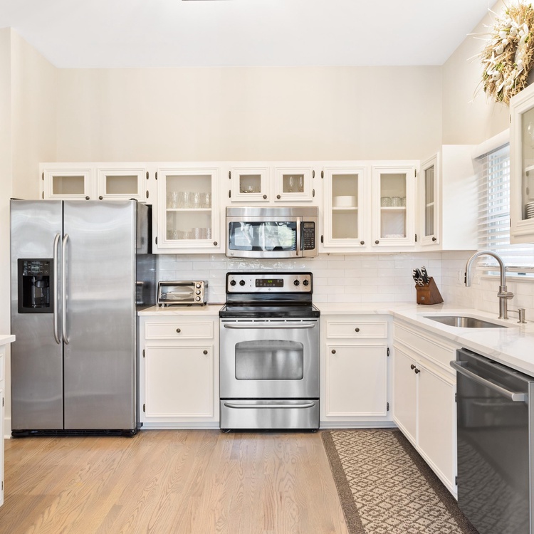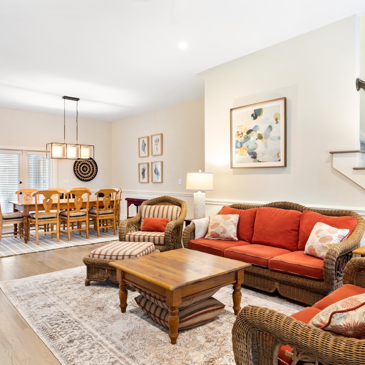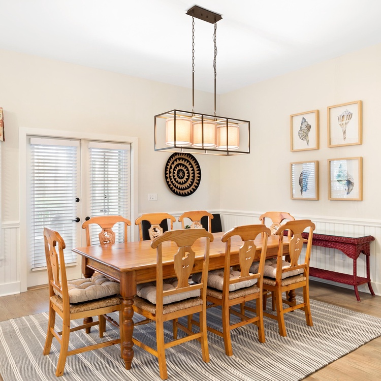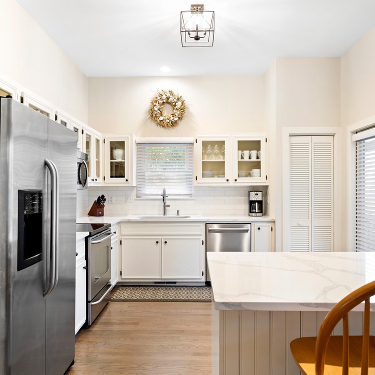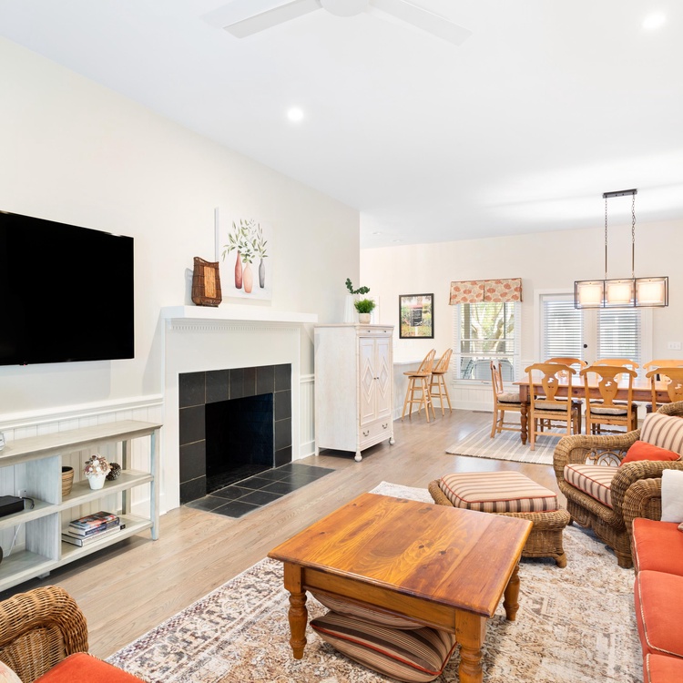 White picket fencing, a gracious front porch, and majestic oak trees welcome you into this charming Lowcountry home. An open floor plan seamlessly connects the living, kitchen, and dining areas. In the living area, spend time relaxing on the colorful sofas or watch TV with the family. The adjacent dining area has a long wooden table to enjoy meals, snacks, and board games. Open and airy, the light-filled kitchen will make cooking enjoyable with its crisp white cabinets, stainless steel appliances, and ample counter space.