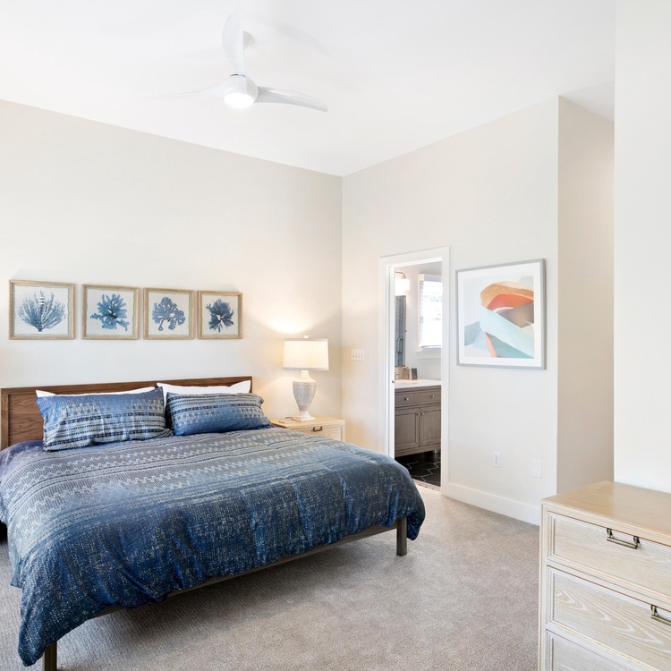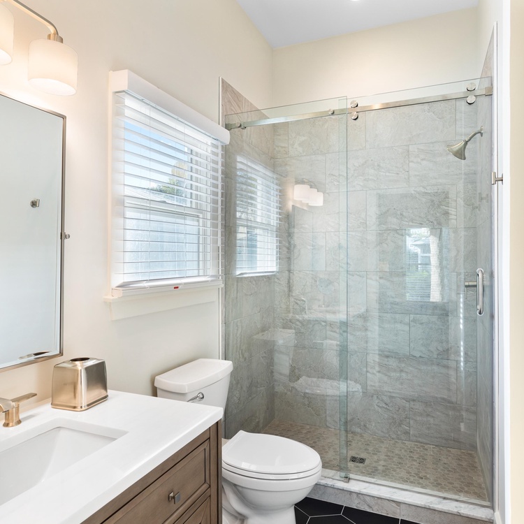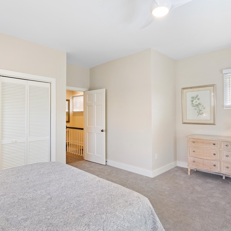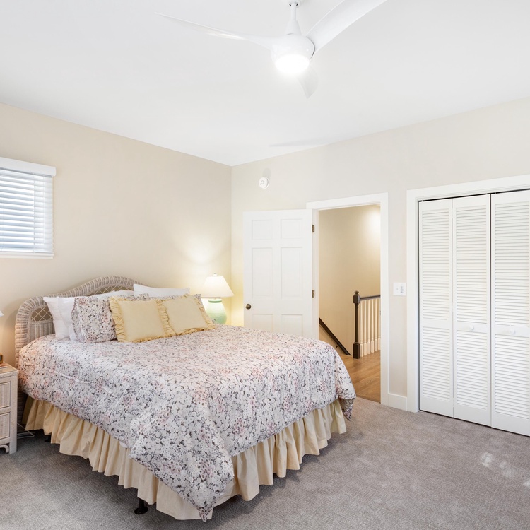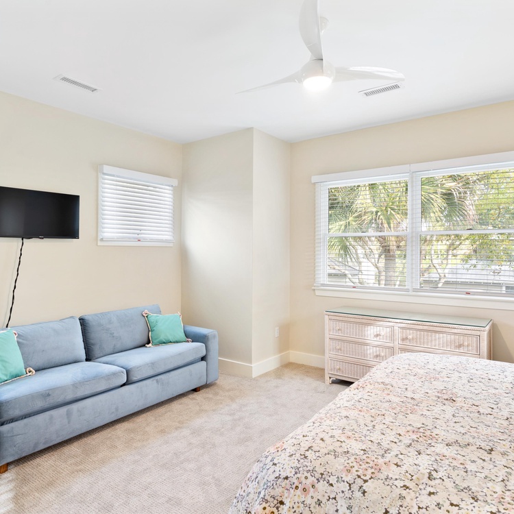 This renovated home offers five comfortable bedrooms and four full bathrooms. On the main floor, you will find the primary suite and two bedrooms. The spacious primary bedroom offers a king-sized bed, a TV, access to the screened porch, and a private bathroom with a walk-in shower. The second bedroom has a king-sized bed, a TV, and an en suite bathroom with a shower/tub combo. A bedroom with two twin beds and convenient access to the full hall bathroom (shower/tub combo) rounds out the first floor. Upstairs you will find the remaining two bedrooms and a full hall bathroom with a shower/tub combo. One bedroom has a queen-sized bed, queen sleeper sofa, and TV, while the other has a queen-sized bed and access to a private balcony where peeks of the ocean can be visible.