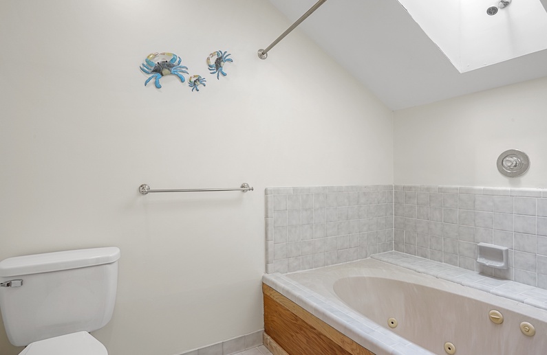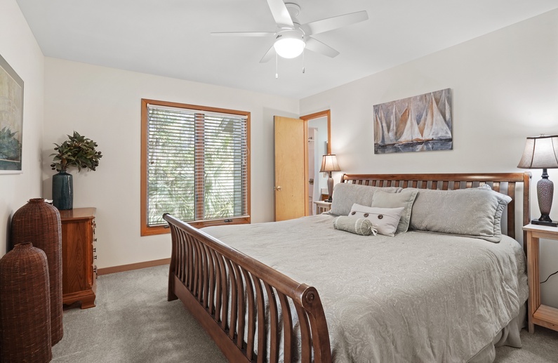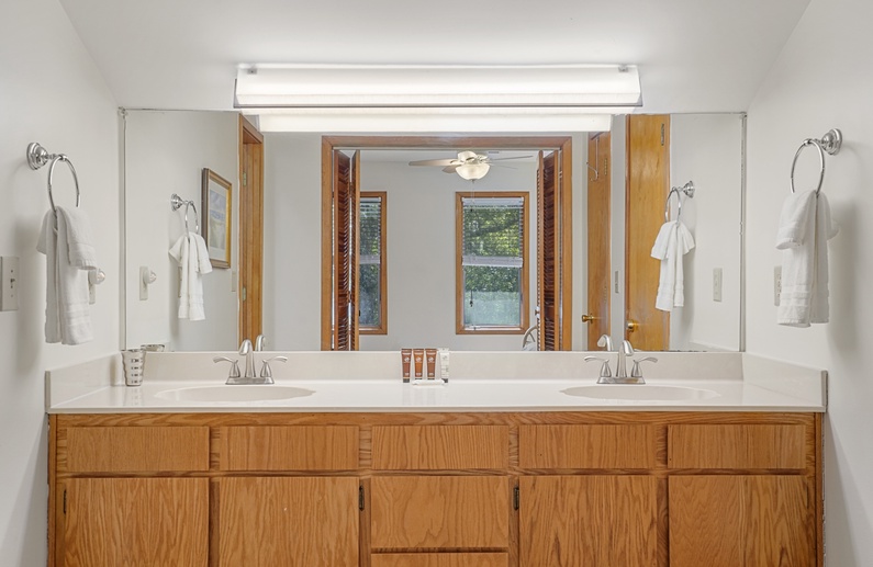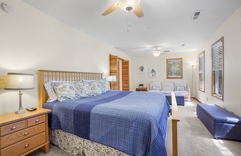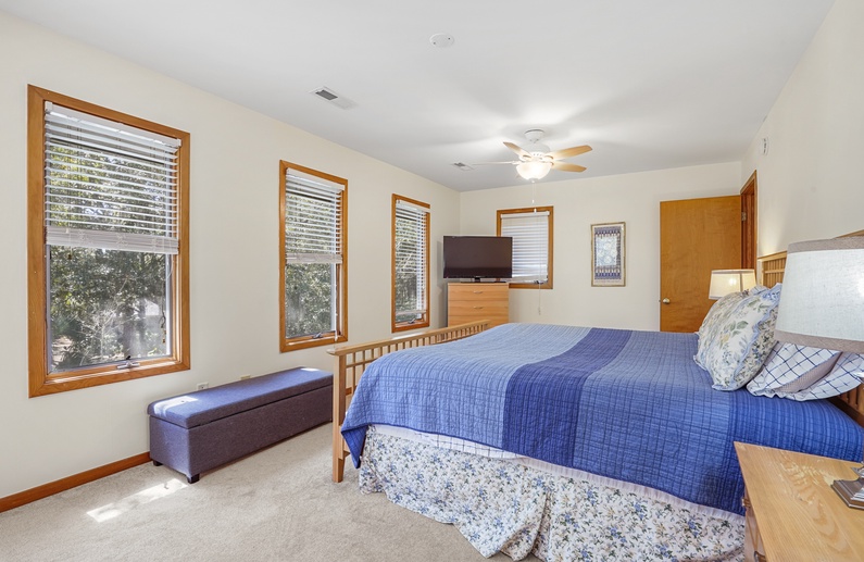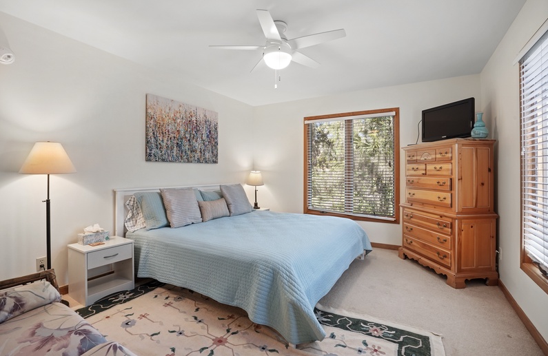The spacious living room, with a vaulted ceiling and an abundance of windows, features three sofas, a wall-mounted TV, a game table and chairs, and access to the screened porch. Enjoy preparing vacation meals in the fully equipped kitchen, offering plenty of counter space and a small center island. The dining room has seating for 14 at the long wooden table and access to the screened porch, back deck, and an additional living area. The second living area has a comfortable loveseat and a TV.