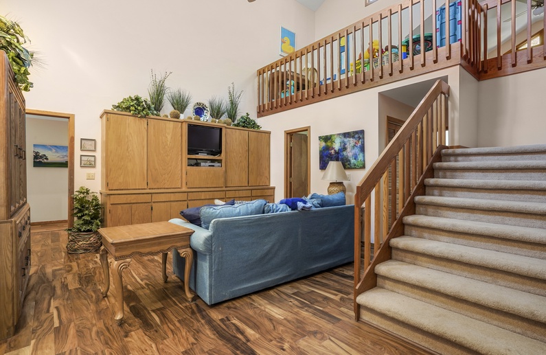 You will find the upstairs primary suite tucked away from the rest of the home. The bedroom has a king bed, TV, sitting area with a sofa, and en suite bathroom with a shower/tub combo and a double sink vanity. The remaining five bedrooms, two with king beds and three with queen beds, are on the main level. There is also a loft area, accessible from stairs in the second living area, with a play area with toys.