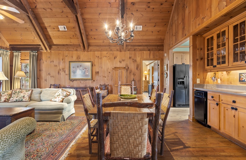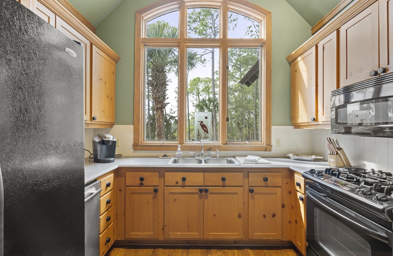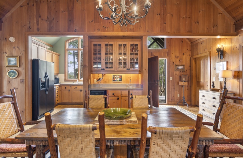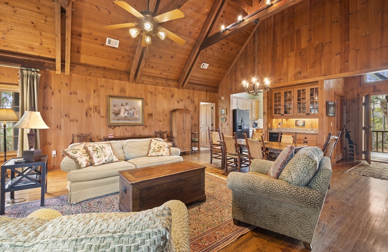 Upon entering the property, you will find a spacious floor plan, high ceilings, and hardwood flooring. In the living area, you will find comfortable seating, a TV, and door access to the screened porch. The fully equipped kitchen offers ample natural light and enough counter space to prepare your vacation meals. The dining area is in close proximity to the kitchen and offers ample seating for your whole party!