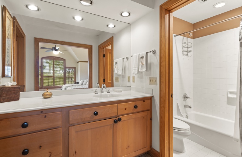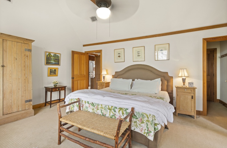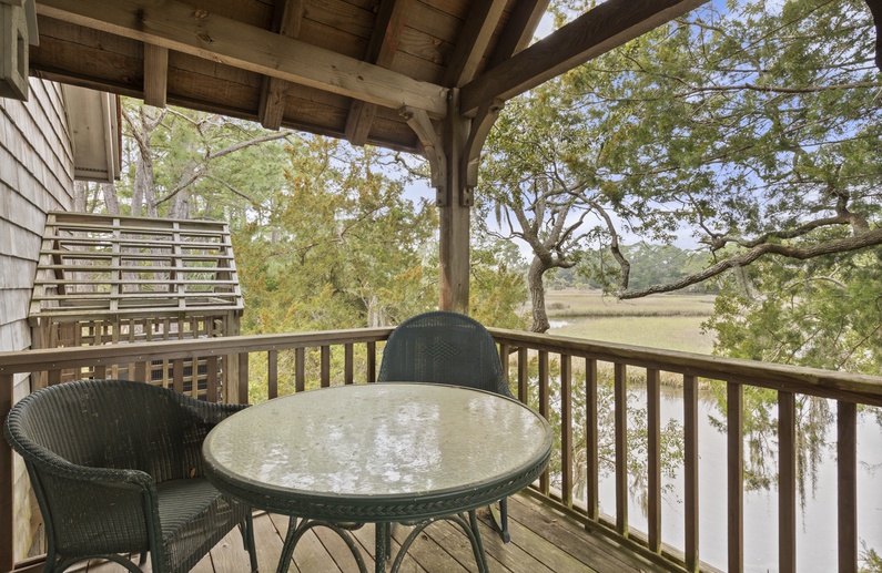 The primary bedroom features a king-sized bed, stunning marsh views, a small writing nook, and door access to a private balcony. The primary bathroom offers a shower and bathtub combination and is located just down the hall.