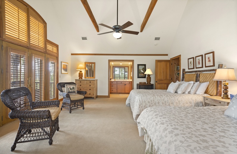 The secondary bedroom features 2 queen-sized beds, marsh views, door access to a private balcony, and a private full bathroom with a shower and bathtub combination.