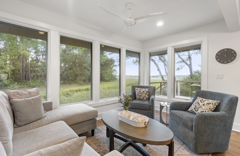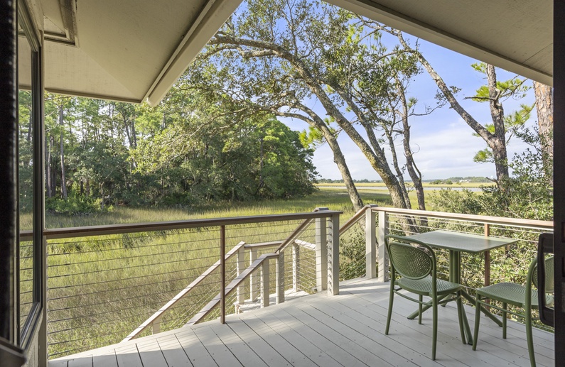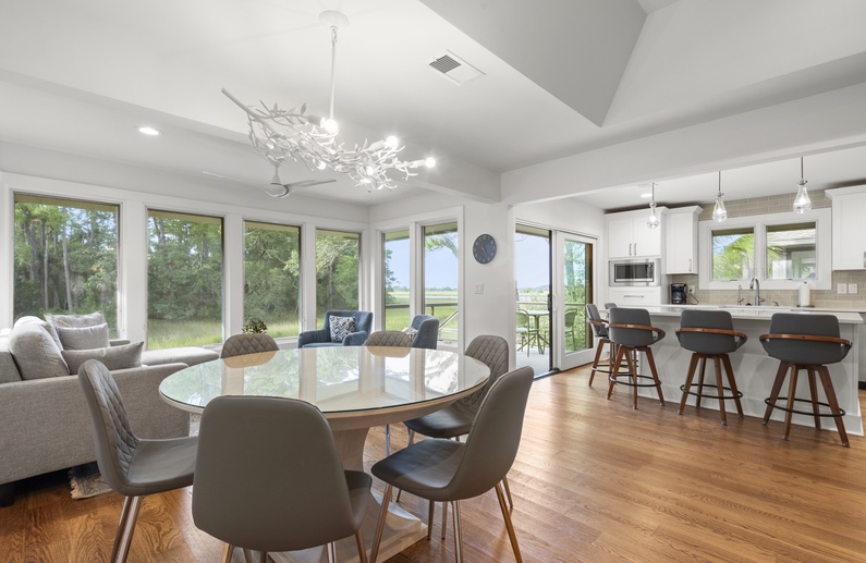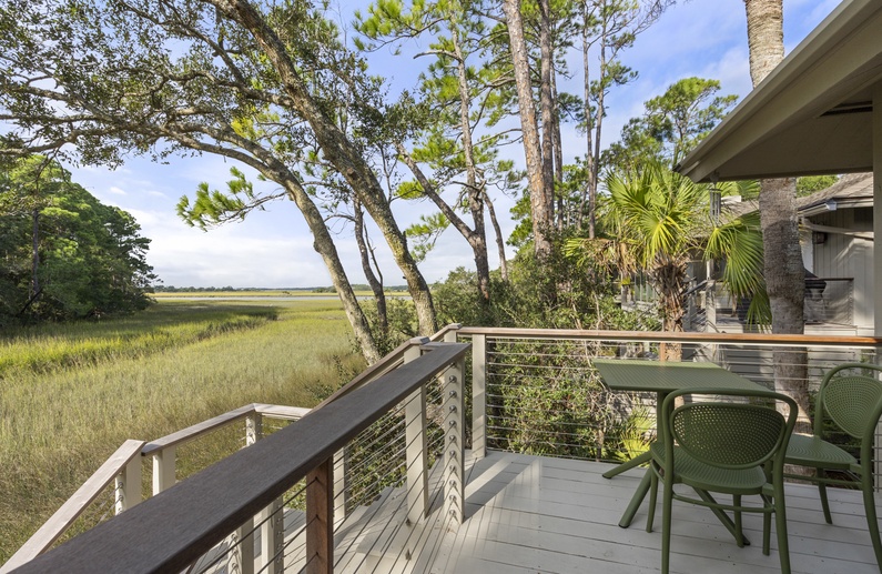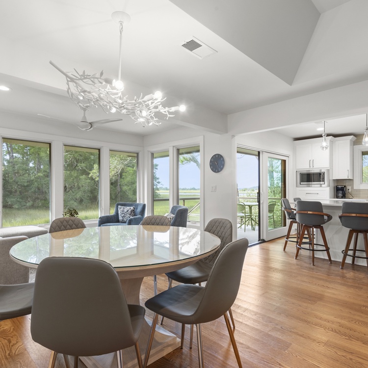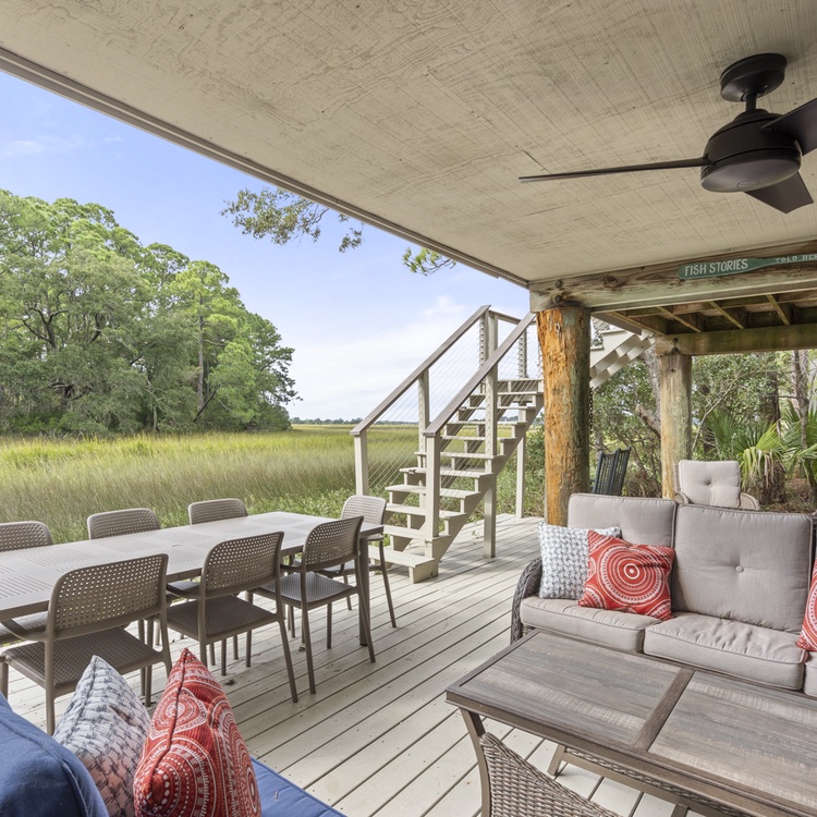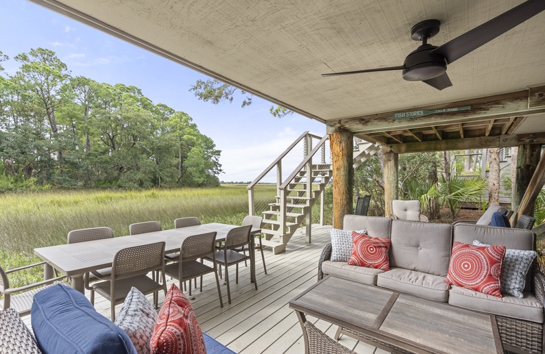 Guests can enjoy relaxing outside in the downstairs outdoor living area or dine al fresco at the large dining table. The deck off the kitchen features a small table where you can enjoy a morning cup of coffee or an evening beverage while overseeing the beautiful marsh and river view. (Photos coming soon!)