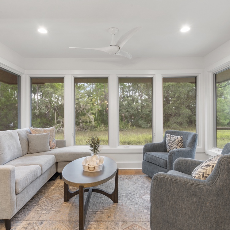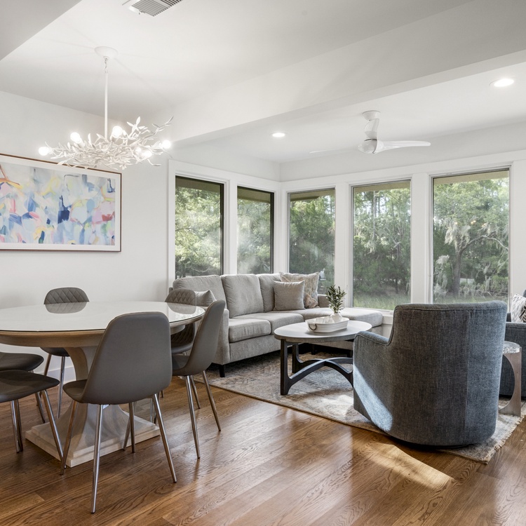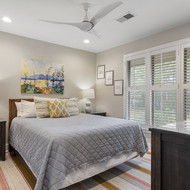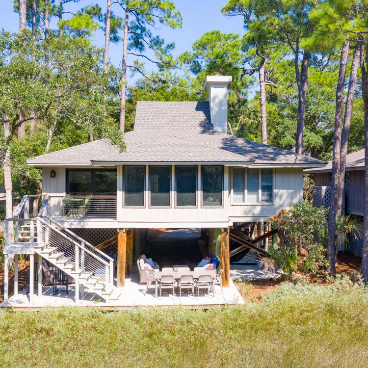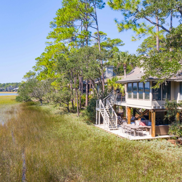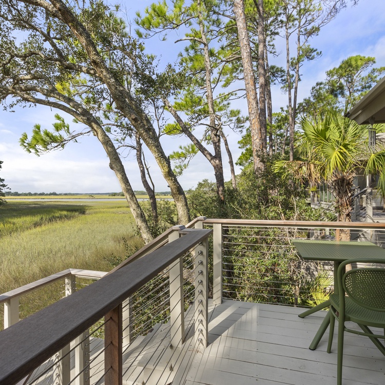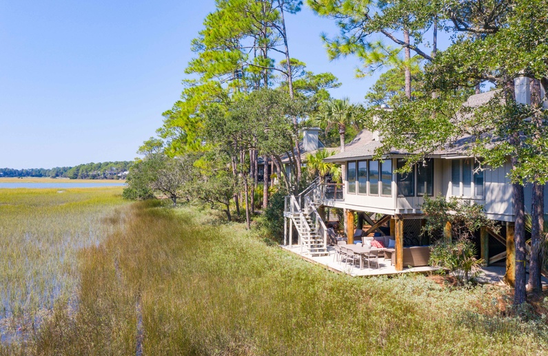 This Kiawah Island vacation rental features three bedrooms, picturesque marsh and river views, multiple outdoor living spaces, and access to the Inlet Cove community dock and seasonal pool. The cottage is less than a 5-minute walk from the beach.