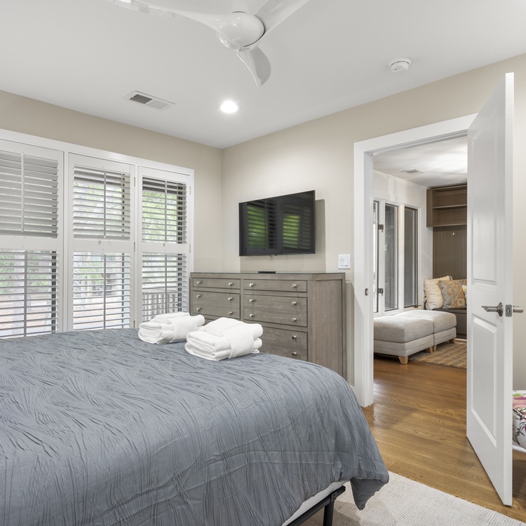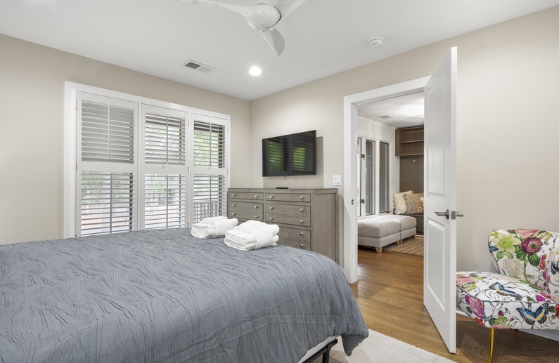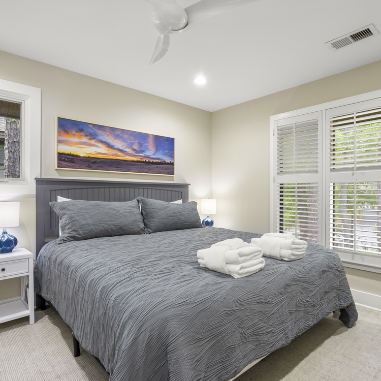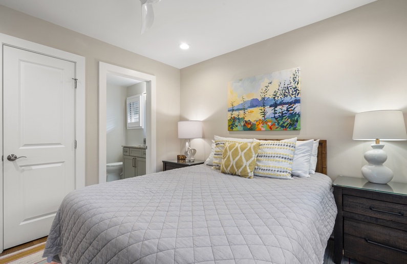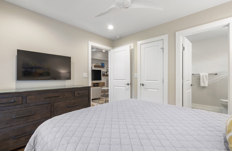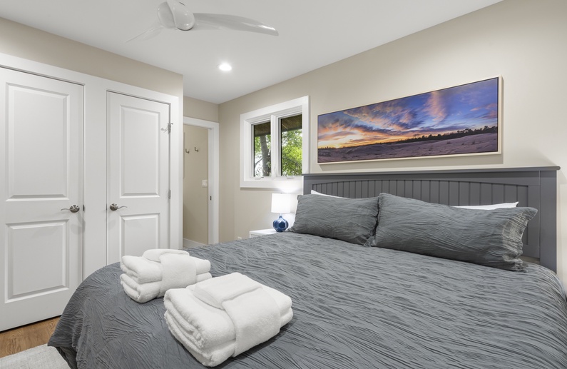 Upon entering the cottage, you are greeted by a beautiful open living plan with a convenient drop zone, perfect to hang your jackets or beach towels, to your left. Immediately on your right is the primary bedroom, which features a king-size bed, flat screen TV, en suite bathroom with double sinks and a walk-in shower.