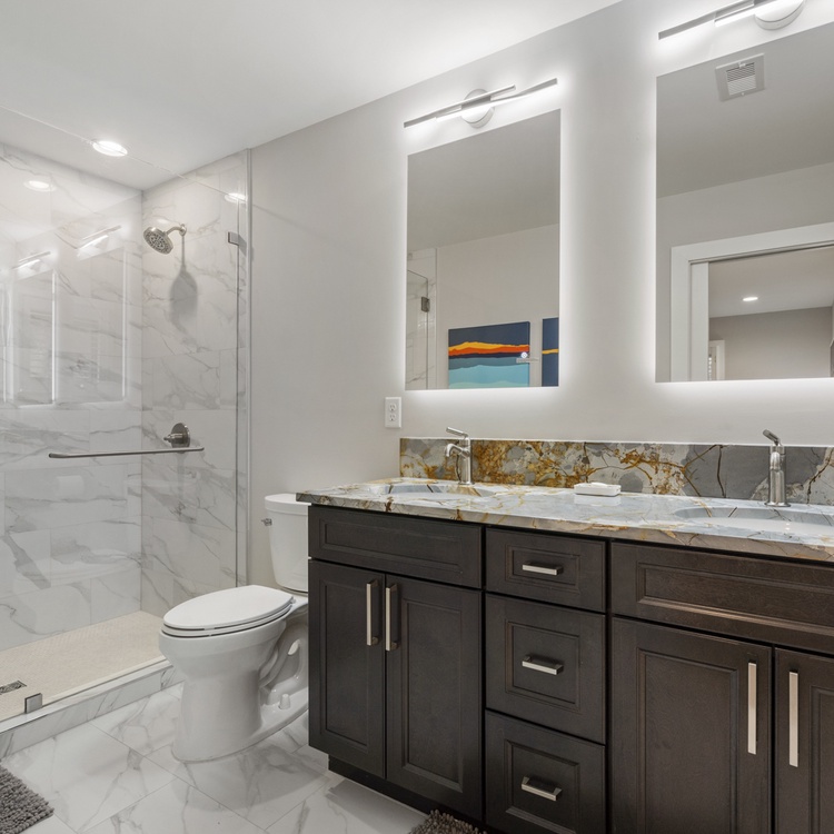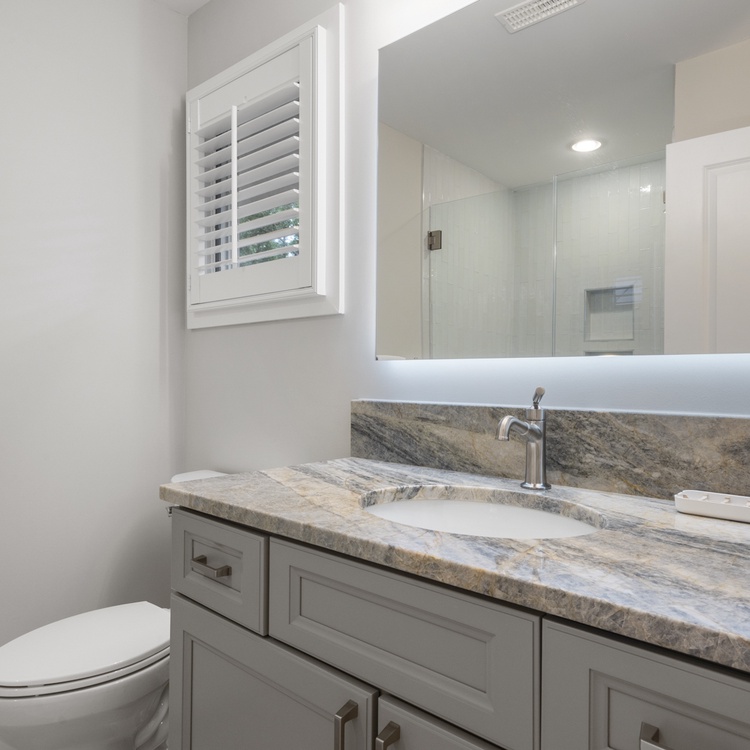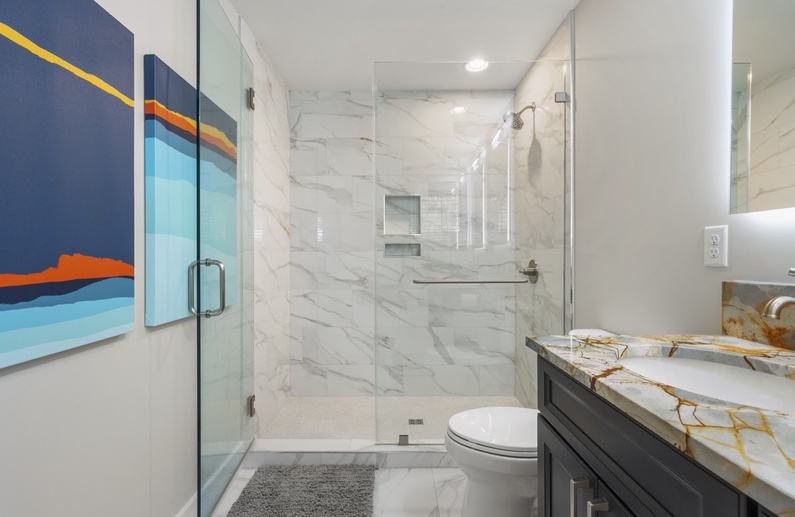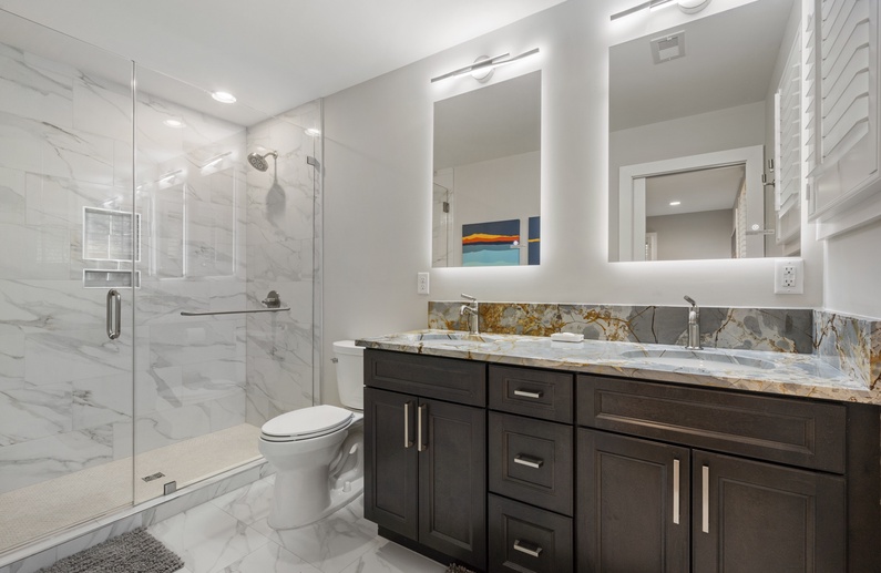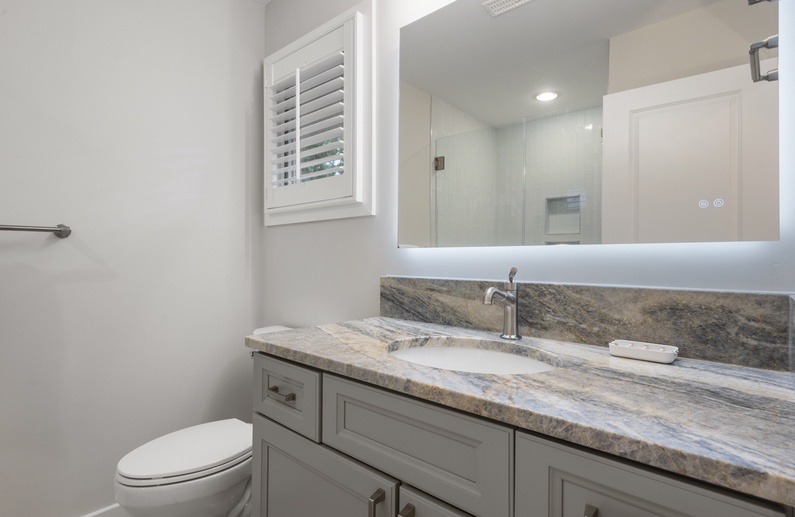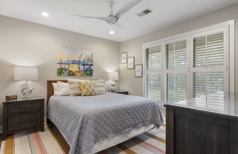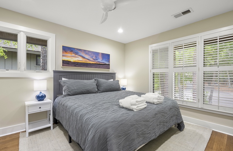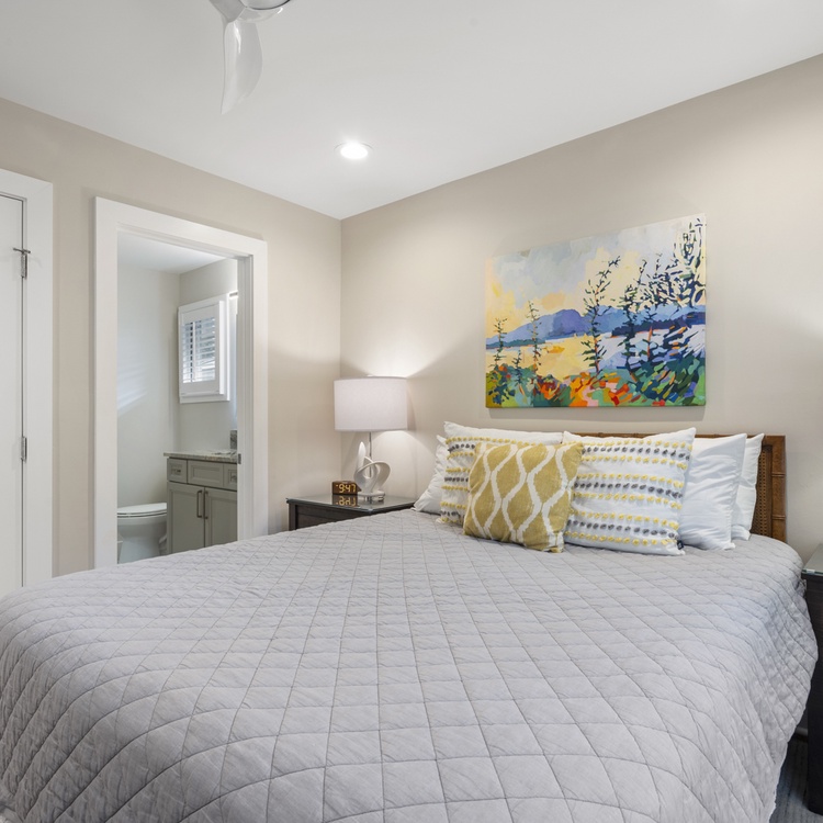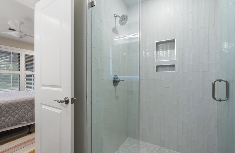 Also offering a beautiful marsh view, the second bedroom provides a queen-size bed, flat screen TV, and newly attached en suite bathroom complete with a walk-in shower.
