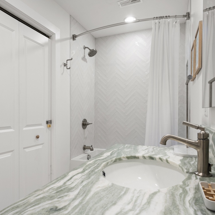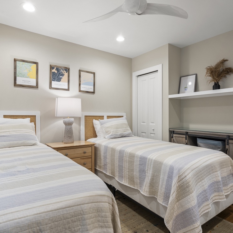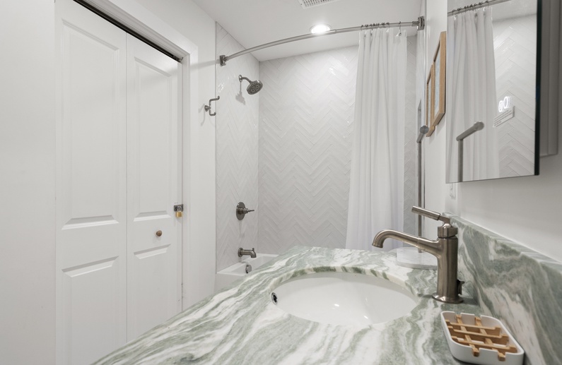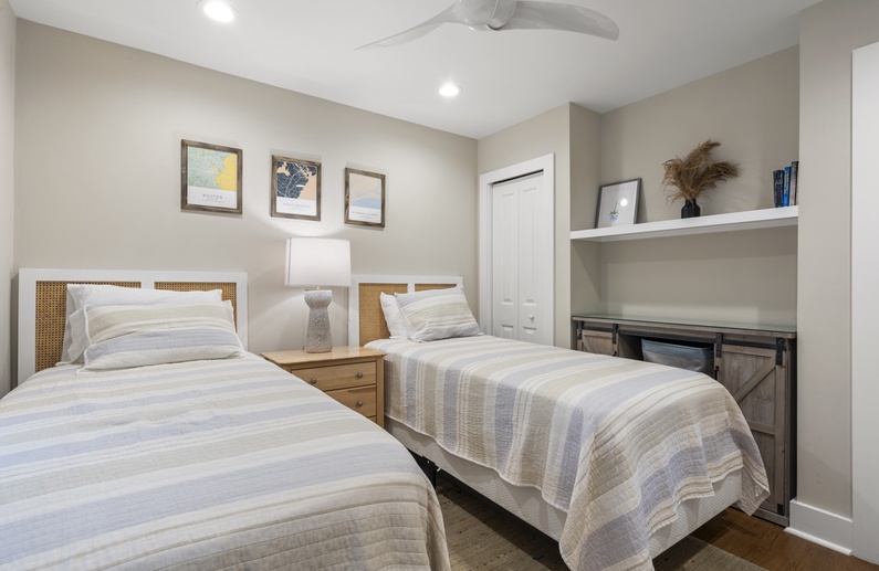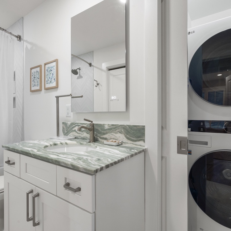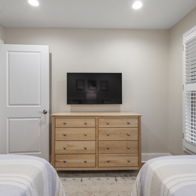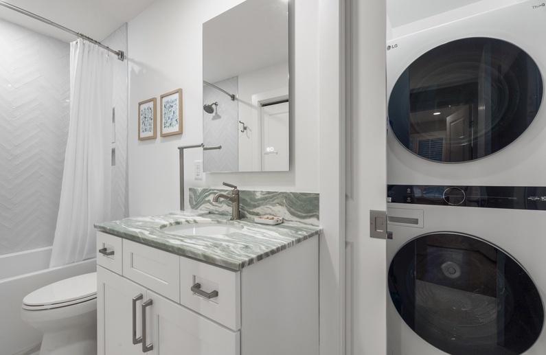 In the third bedroom you will find two extra long twins that may be converted to a king upon request. A flat screen TV, as well as games, are available for the whole family to enjoy. The bathroom is just across the hall and features a shower/tub combo. The full-size stacked washer and dryer are also located in the third bathroom.