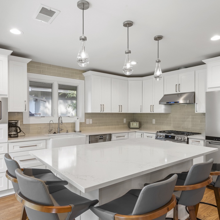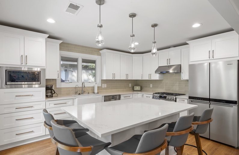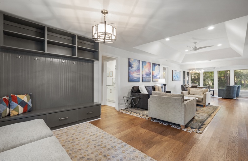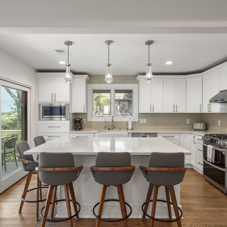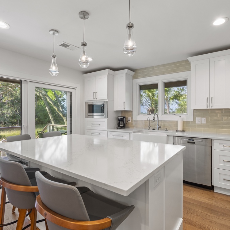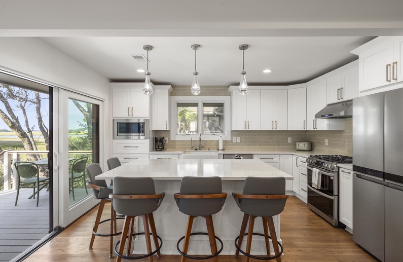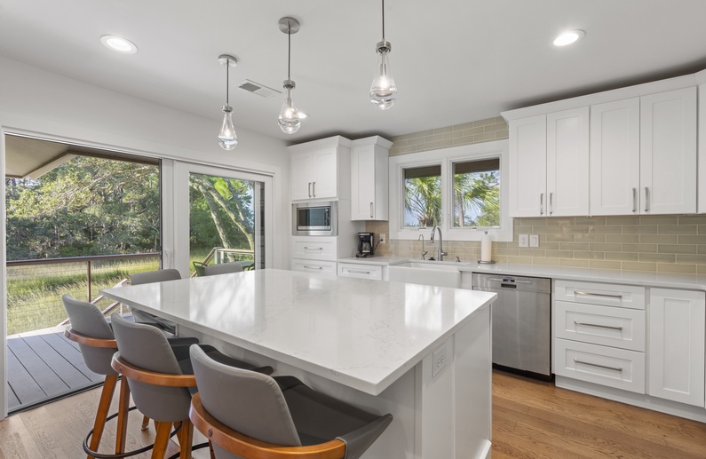 The kitchen, featuring quartz countertops, brand new stainless steel appliances, a reverse osmosis water tap, and additional seating at the island, has been relocated to the back of the home so that you can enjoy the picturesque view of the marsh and river.