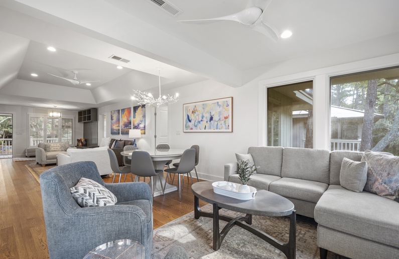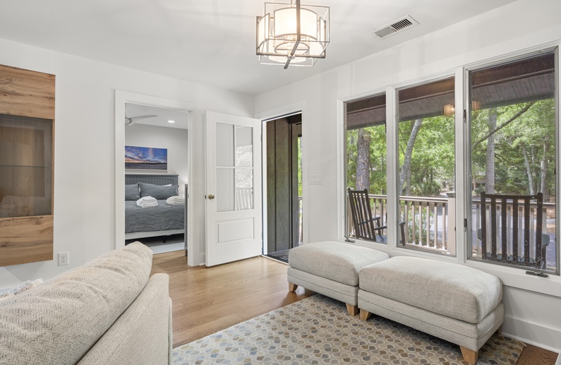 The spacious living area offers a couch and two lounge chairs, plus a large flat-screen TV for everyone to enjoy. Just behind the living room, you will find the dining area with seating for six, as well as the cozy sunroom with additional space for relaxation.