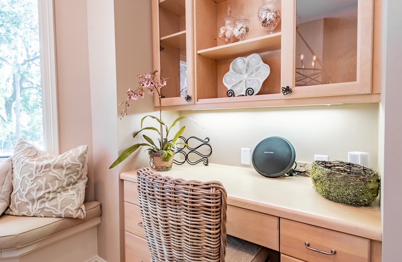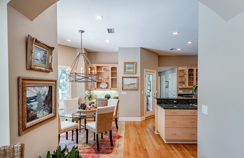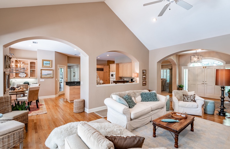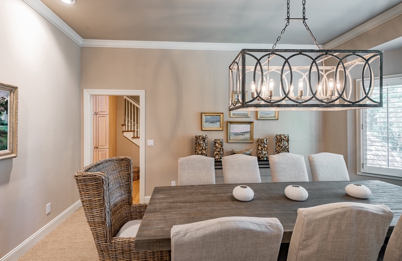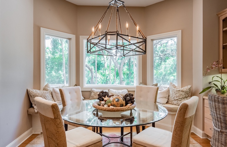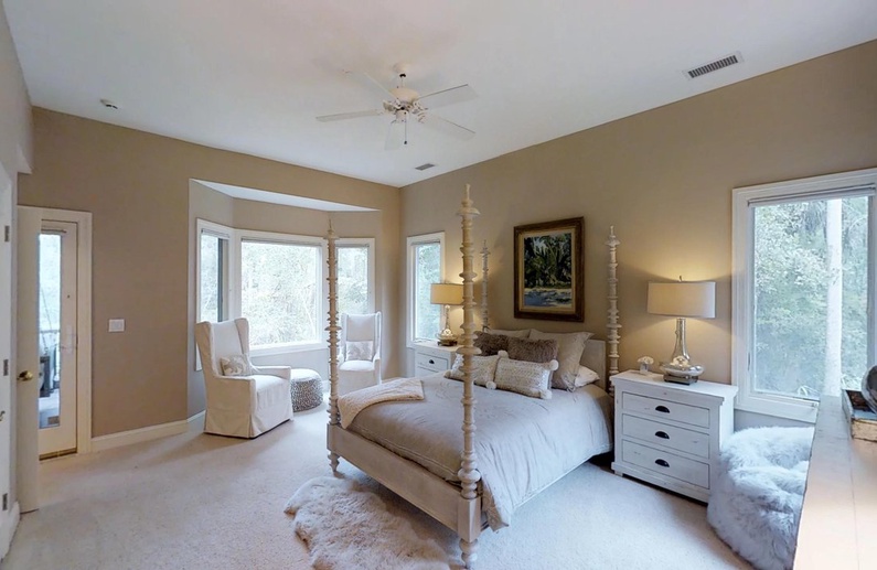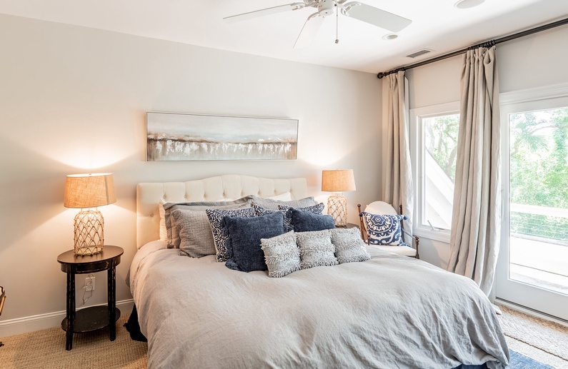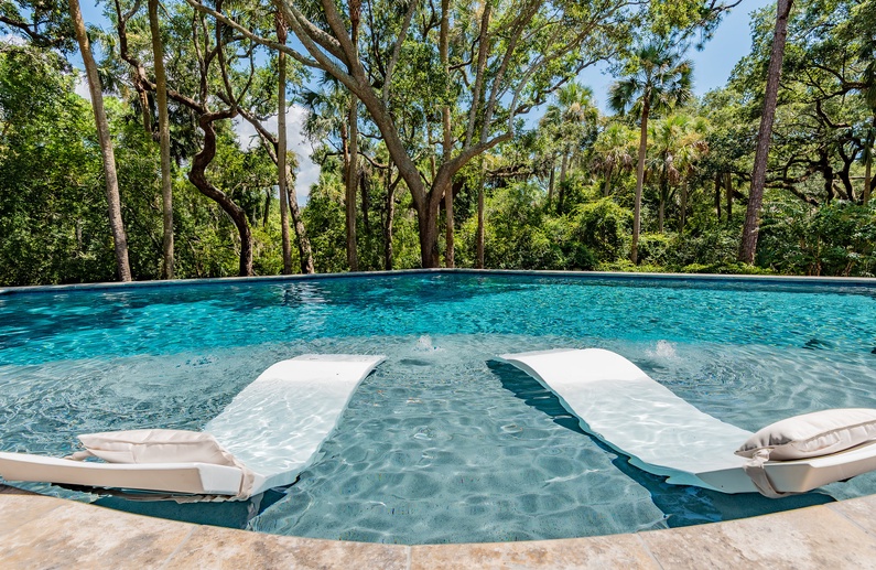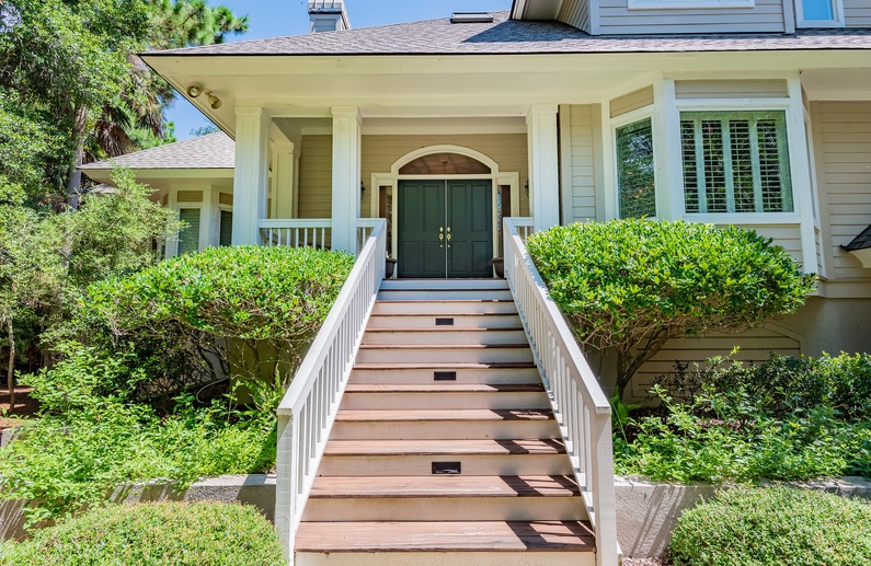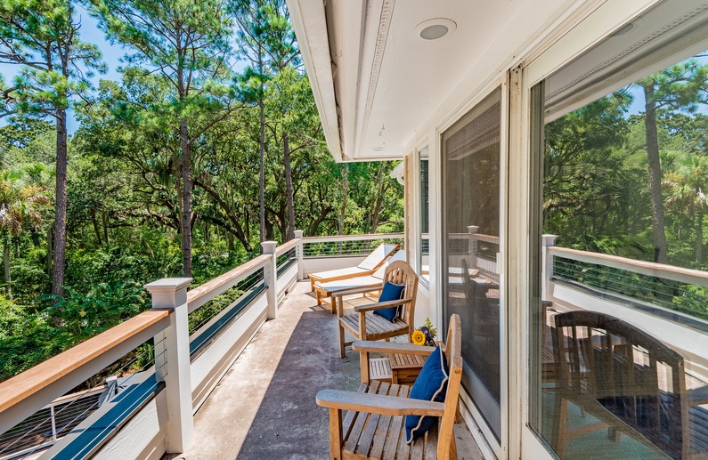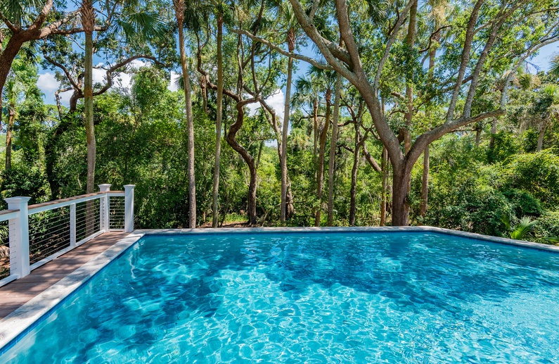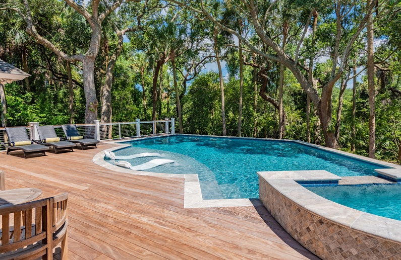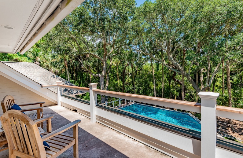 This Kiawah Island vacation rental, located in Vanderhorst Plantation, offers five bedrooms, a private saltwater pool and spa, and plenty of indoor/outdoor living space. The home is situated on a quiet cul-de-sac off Flyway and is about a 2-minute walk to the beach.