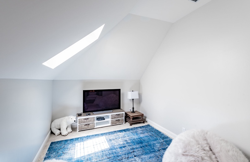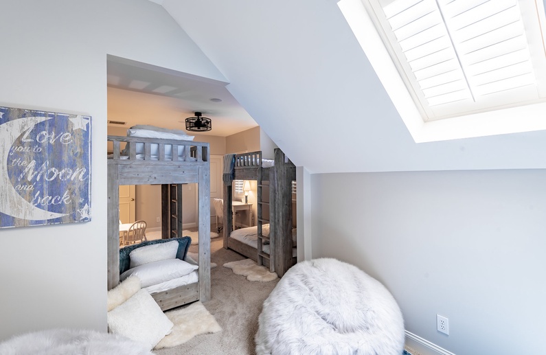 Upstairs, you will find a king bedroom with its own private balcony and TV, a queen bedroom, and a bedroom with a twin-over-twin bunk bed and a full-over-full bunk bed. There is a 4K OLED TV with Apple TV in the “media area” of the bunk room. There are two hallway bathrooms also located upstairs.