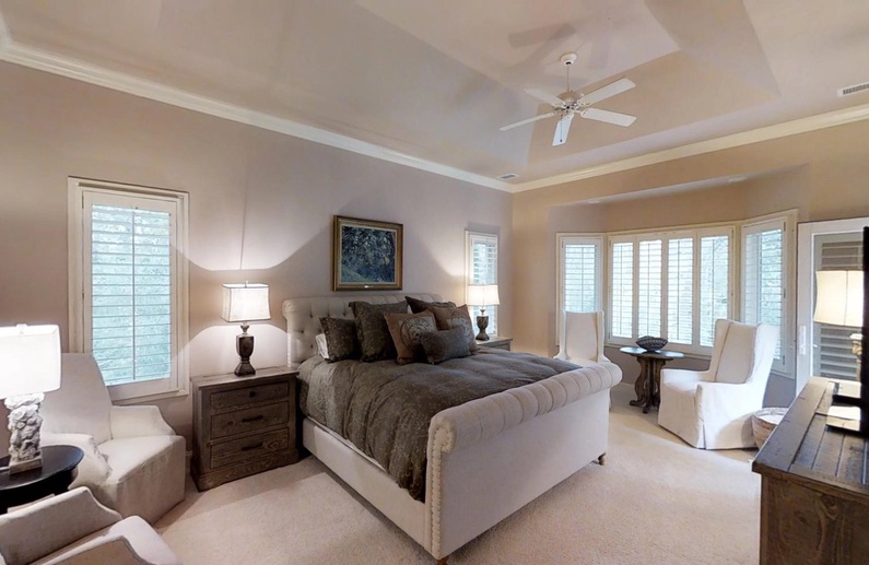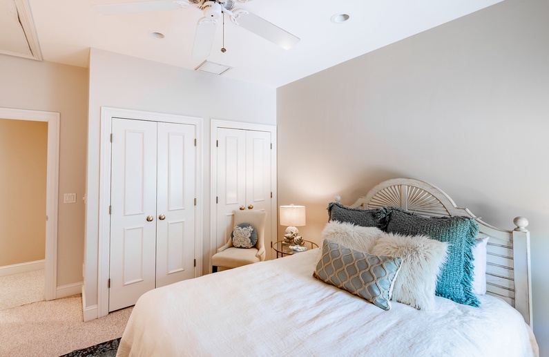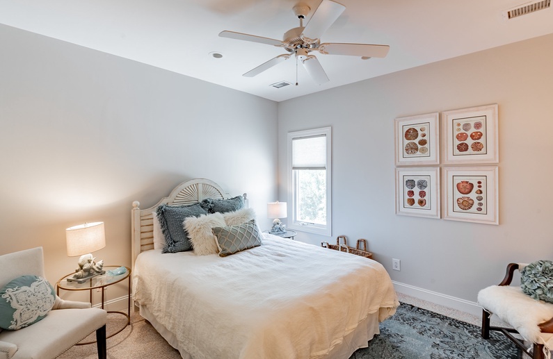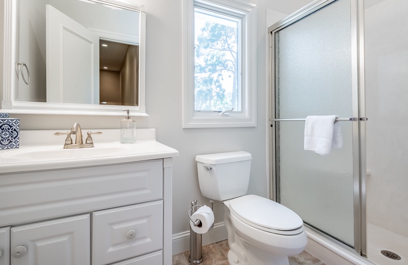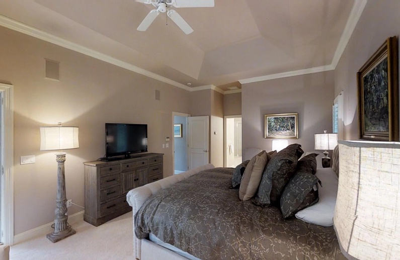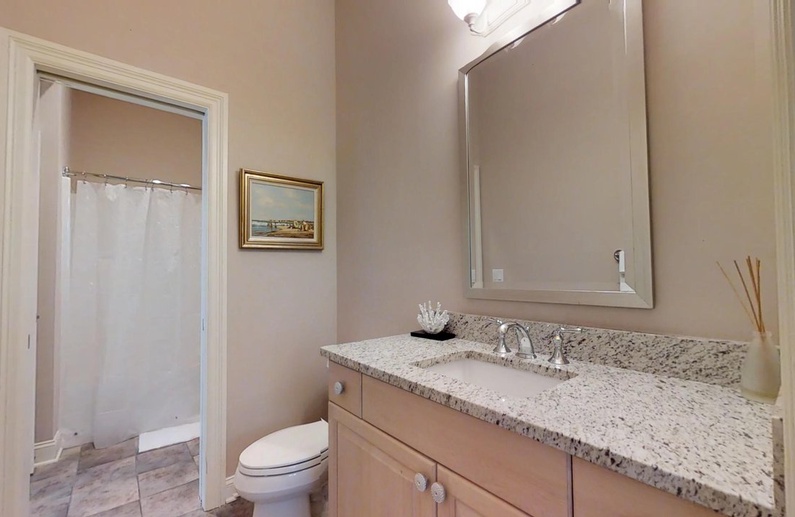 On the first floor, there is a primary bedroom with a king bed, TV, access to the back deck and pool, and a private bathroom with a shower, luxurious tub, private toilet area, and a large walk-in closet. Also downstairs is a queen bedroom with a TV, access to the screened porch, and a bathroom with shower/tub combo that can be accessed from the bedroom or the hallway. The large laundry space completes the downstairs.