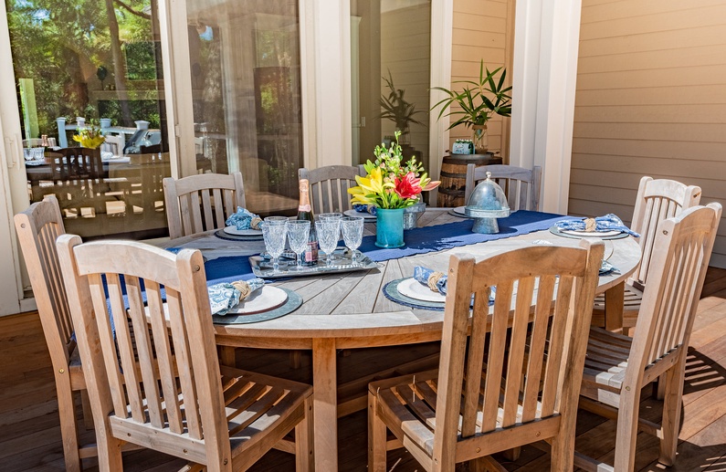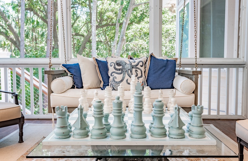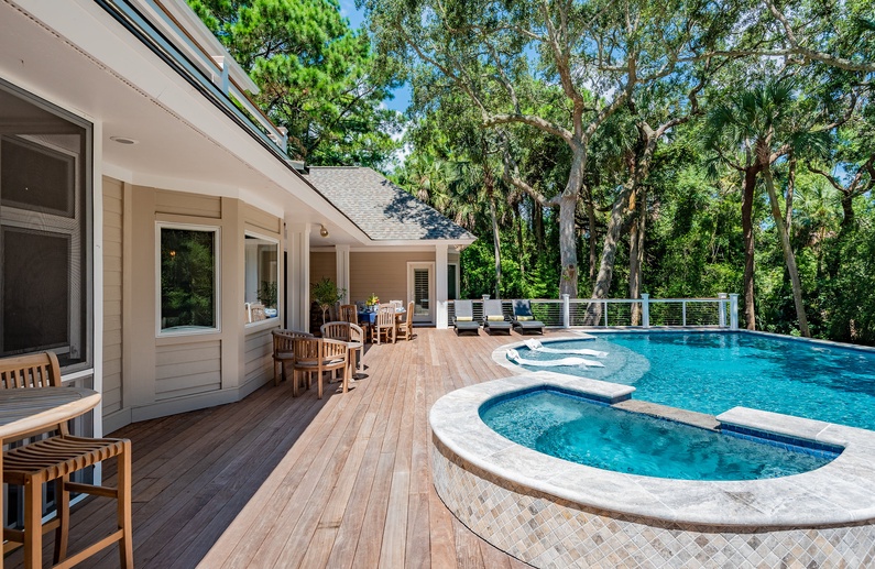 The screened porch offers ample seating, a porch swing, and a lovely pool view. Outside the porch, you will find the large IPE deck with the pool and spa. The saltwater pool includes a sun shelf. Guests will also enjoy the convenience of the outdoor shower.